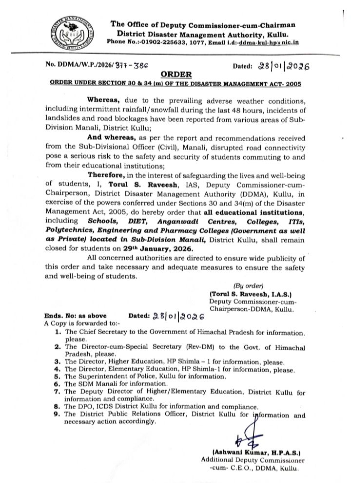 • मनाली उपमंडल में 29 जनवरी को बंद रहेंगे शिक्षण संस्थान, आदेश जारी