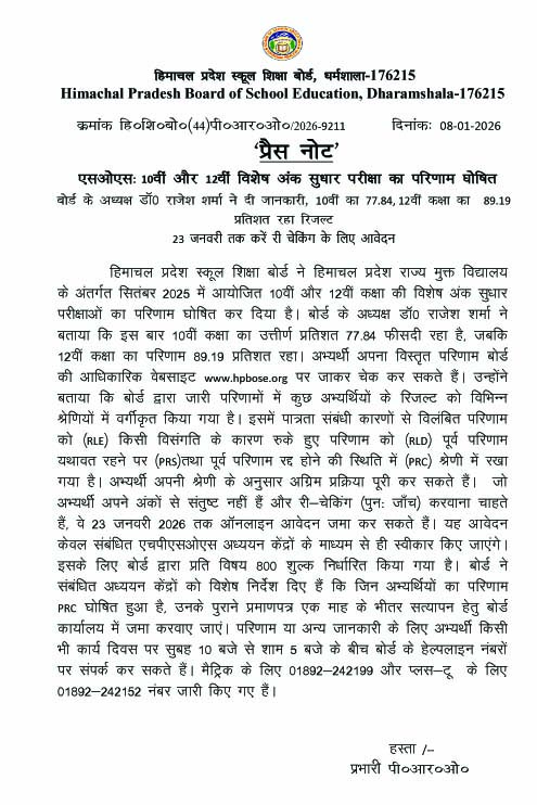 • हिमाचल प्रदेश स्कूल शिक्षा बोर्ड ने 10वीं और 12वीं का ये रिजल्ट किया घोषित
