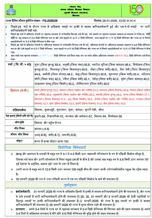शिमला। मौसम विज्ञान केंद्र शिमला की 28 जनवरी, 2026 की अपडेट के अनुसार 01 फरवरी 2026 को राज्य के अधिकांश हिस्सों में हल्की से मध्यम बारिश/बर्फबारी और राज्य के ऊंचे इलाकों में भारी बारिश/बर्फबारी होने की संभावना है।