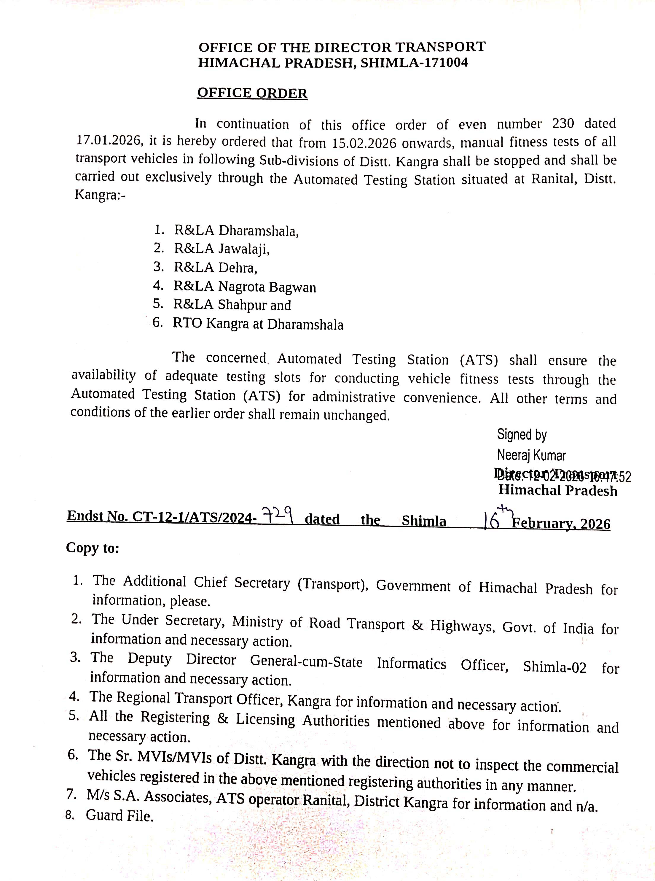 इस बैठक में निदेशक परिवहन द्वारा उपमंडल धर्मशाला, ज्वालाजी, देहरा, नगरोटा बगवां और शाहपुर के अंतर्गत सभी वाहनों की पासिंग अनिवार्य रूप से ऑटोमेटेड टेस्टिंग स्टेशन जोकि रानीताल में स्थापित है के द्वारा करवाने के आदेशों पर विस्तार से चर्चा हुई। सभी बस ऑपरेटर ने इन आदेशों पर कड़ा विरोध जताया।