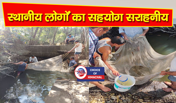 मंडी : राहेरा नाले में फंसी लगभग 50 हजार मछलियों के बच्चों को मत्स्य विभाग ने बचाया