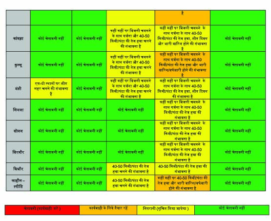 23 जनवरी को चंबा, कुल्लू, लाहौल स्पीति में कहीं-कहीं पर बिजली चमकने के साथ गर्जना के साथ 40 से 50 किलोमीटर प्रति घंटा की तेज हवा और भारी बारिश/बर्फबारी की संभावना को लेकर ऑरेंज अलर्ट जारी है। ऊना, बिलासपुर, कांगड़ा जिला में कहीं कहीं पर बिजली चमकने के साथ गर्जना सहित 40 से 50 किलोमीटर प्रतिघंटा की तेज हवा, शीत दिवस और भारी बारिश का अनुमान है।