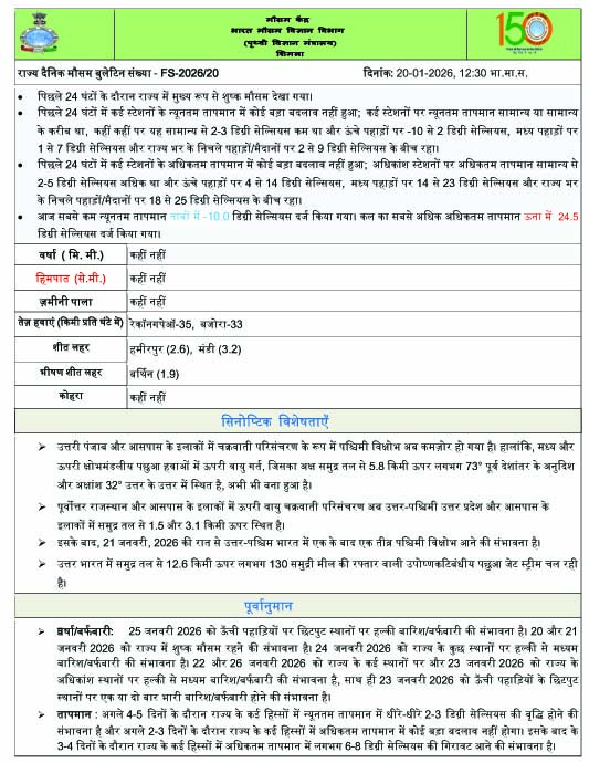 25 जनवरी को ऊंची पहाड़ी क्षेत्रों में छिटपुट स्थानों पर हल्की बारिश/बर्फबारी की संभावना है। 26 जनवरी को भी कुछ स्थानों पर मौसम खराब रह सकता है। पिछले 24 घंटे में रिकांगपिओ और बजौरा में तेज हवाएं चली हैं। हमीरपुर और मंडी में शीतलहर ने सताया है।