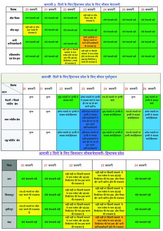 22 जनवरी को ऊना, बिलासपुर, हमीरपुर, चंबा, कांगड़ा, कुल्लू और मंडी में कहीं कहीं पर बिजली चमकने के साथ गर्जना और 40 से 50 किलोमीटर प्रतिघंटा की तेज हवा चलने की संभावना को लेकर येलो अलर्ट जारी है।