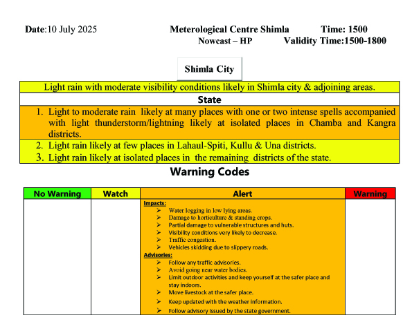 कई स्थानों पर हल्की से मध्यम बारिश की संभावना है। साथ ही चंबा और कांगड़ा जिलों में कुछ स्थानों पर हल्की गरज/बिजली गिरने का अनुमान है।