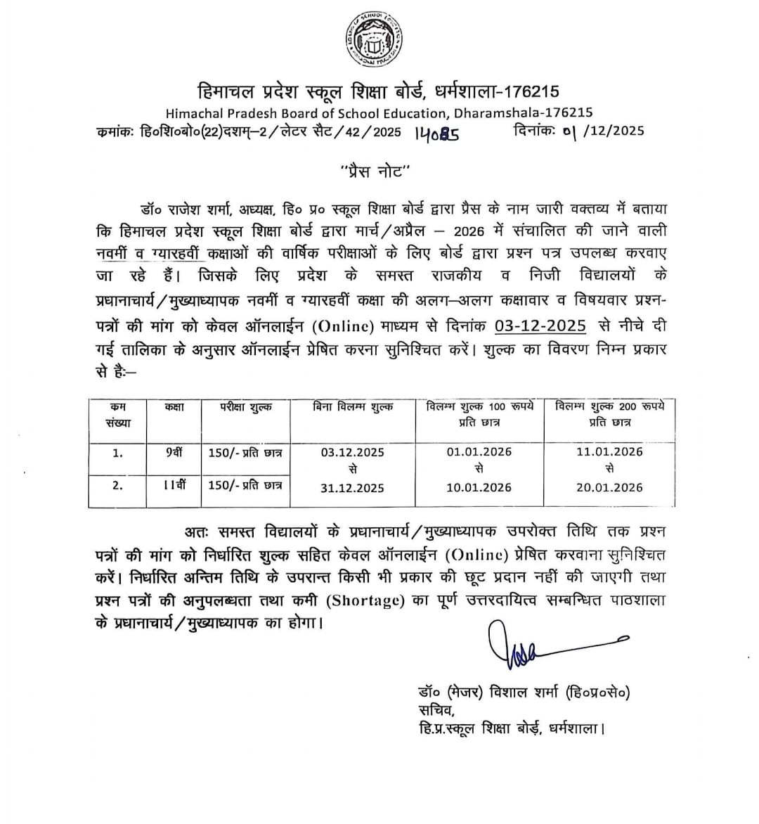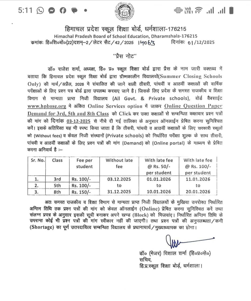 प्रश्नों के लिए संबंधित स्कूल 3 दिसंबर, 2025 से डिमांड भेज सकते हैं। हिमाचल प्रदेश स्कूल शिक्षा बोर्ड के अध्यक्ष डॉ. राजेश शर्मा ने बताया कि तीसरी, 5वीं और 8वीं कक्षा के सरकारी स्कूलों के छात्रों के लिए कोई फीस नहीं लगेगी।