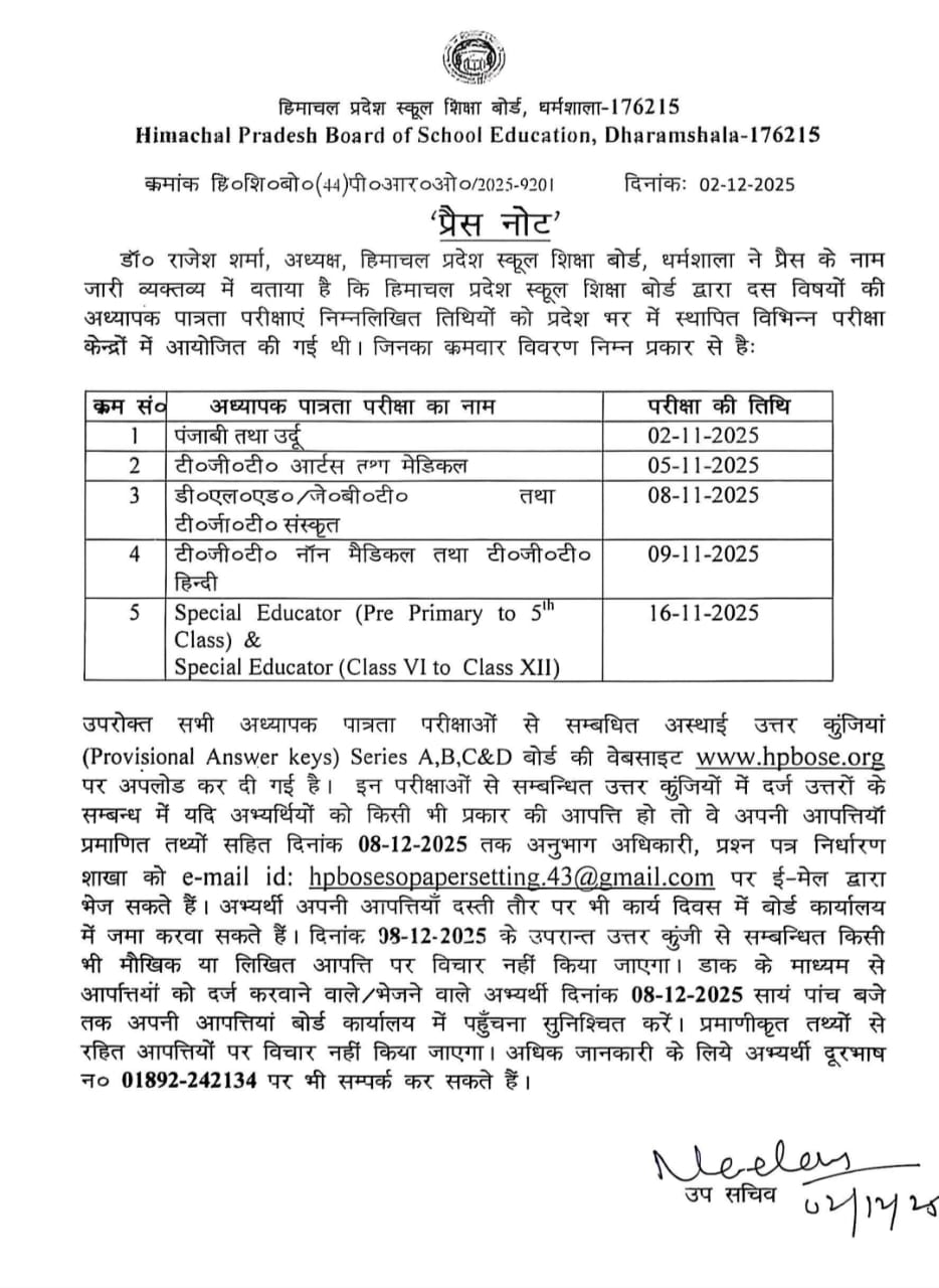इसमें दर्ज उत्तरों के संबंध में यदि किसी अभ्यर्थी को किसी भी प्रकार की आपत्ति हो तो वे अपनी आपत्तियां प्रमाणित तथ्यों सहित 8 दिसंबर, 2025 तक अनुभाग अधिकारी प्रश्न पत्र निर्धारण शाखा की ईमेल आईडी hpbosesopapersetting.43@gmail.com पर भेज सकते हैं।