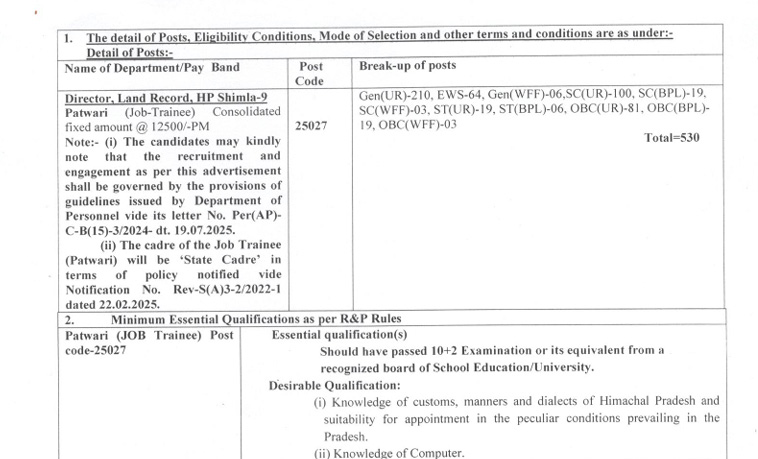 हिमाचल प्रदेश राज्य चयन आयोग (HPRCA) ने शनिवार को दो अलग-अलग अधिसूचनाएं जारी करते हुए पटवारियों के 530 पदों और सहायक स्टाफ नर्स के 312 पदों के लिए पात्र उम्मीदवारों से 16 जनवरी तक ऑनलाइन आवेदन आमंत्रित किए हैं।