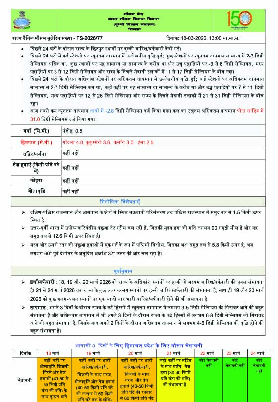 हिमाचल प्रदेश में पिछले 24 घंटे में अधिकतम और न्यूनतम तापमान में बढ़ोतरी दर्ज की गई है। वहीं, हिमाचल में इस माह मार्च में 18 मार्च तक सामान्य से 54 फीसदी कम बारिश हुई है।