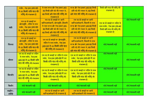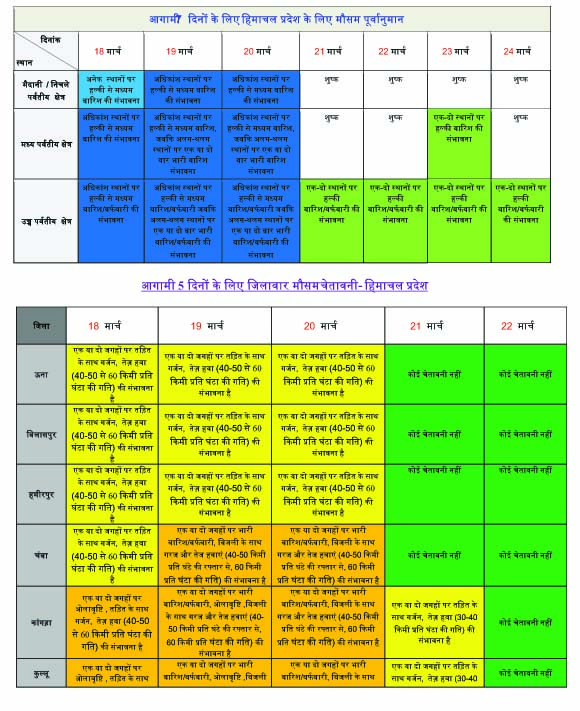 वहीं, शिमला में एक दो स्थानों पर ओलावृष्टि, तेज हवा चलने की संभावना को ऑरेंज अलर्ट है। 20 मार्च को चंबा, कांगड़ा, कुल्लू, मंडी, शिमला और लाहौल स्पीति में भारी बारिश/बर्फबारी को लेकर ऑरेंज अलर्ट है।