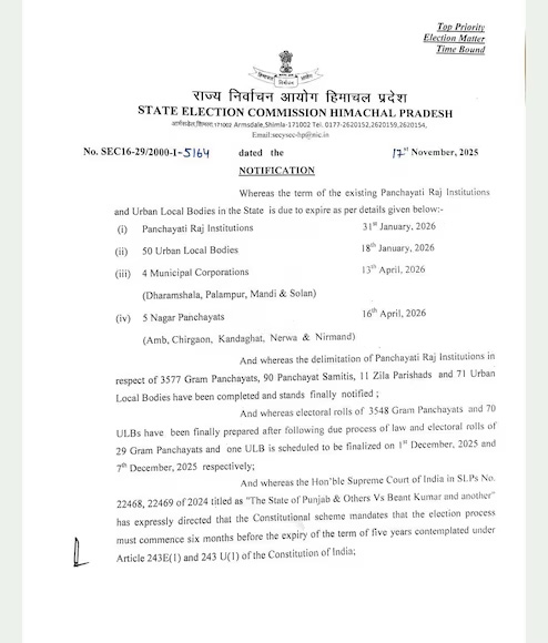 आयोग ने अपनी नोटिफिकेशन में लिखा गया है कि “द स्टेट ऑफ पंजाब एंड अदर्स बनाम बेंट कुमार” मामले में सुप्रीम कोर्ट ने हाल ही में अपने आदेश में कहा था कि किसी भी संस्था के कार्यकाल समाप्त होने से छह महीने पहले अनिवार्य चुनावी प्रक्रिया शुरू होनी चाहिए और इसी संवैधानिक व्यवस्था के तहत हिमाचल प्रदेश में पंचायत और शहरी निकायों के चुनाव की प्रक्रिया समय पर शुरू की जाएगी. राज्य में अब चुनाव कार्यक्रम जारी होने की तैयारियाँ अंतिम चरण में मानी जा रही हैं।