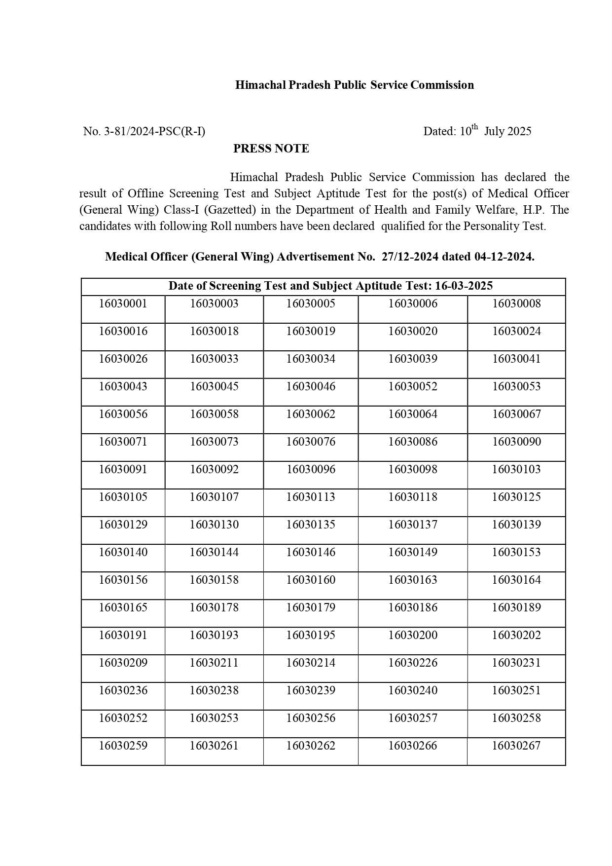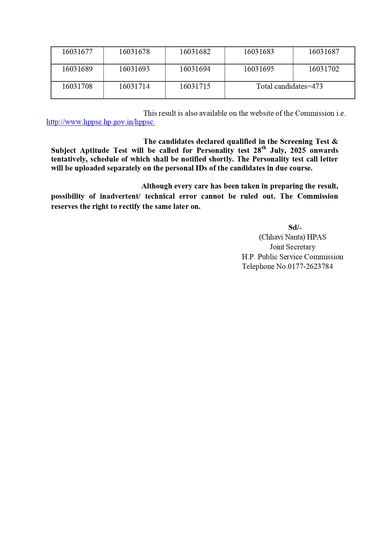 व्यक्तित्व परीक्षण के लिए कॉल लेटर उम्मीदवारों की व्यक्तिगत आईडी पर अलग से अपलोड कर दिए जाएंगे। रिजल्ट हिमाचल प्रदेश लोक सेवा आयोग की वेबसाइट पर भी उपलब्ध है। रिजल्ट निकाले की पुष्टि आयोग की संयुक्त सचिव छवि नांटा ने की है।