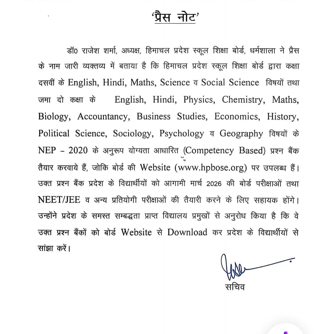 हिमाचल प्रदेश स्कूल शिक्षा बोर्ड के अध्यक्ष डॉ. राजेश शर्मा ने बताया कि बोर्ड द्वारा कक्षा 10वीं के अंग्रेजी, हिंदी, गणित, साइंस और सोशल साइंस विषयों व 12वीं कक्षा के अंग्रेजी, हिंदी, फिजिक्स, केमिस्ट्री, गणित, बायोलॉजी, अकाउंटेंसी, बिजनेस स्टडी, इकोनॉमिक्स, हिस्ट्री, राजनीति शास्त्र, सोशलॉजी, साइकोलॉजी, जियोग्राफी विषयों के NEP-2020 के अनुरूप योग्यता आधारित प्रश्न बैंक तैयार करवाए हैं।
