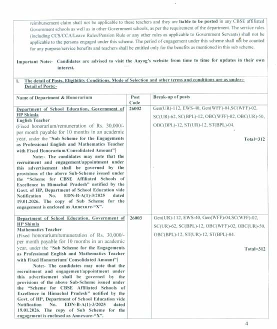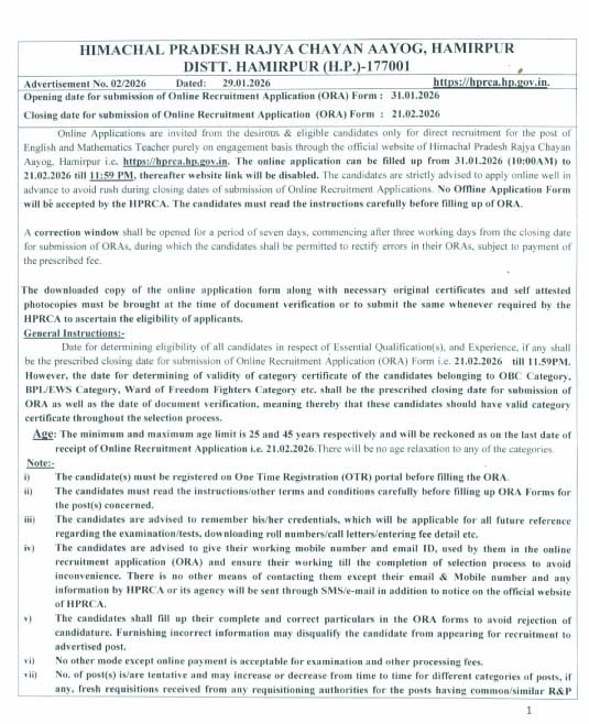 हमीरपुर। हिमाचल प्रदेश राज्य चयन आयोग ने इंग्लिश टीचर और गणित शिक्षक के 624 पदों पर भर्ती निकाली है। जारी विज्ञापन के अनुसार इंग्लिश टीचर पोस्ट कोड 26002 के 312 और गणित टीचर पोस्ट कोड 26003 के 312 पदों पर भर्ती होगी। इन पदों के लिए 31 जनवरी 2026 से ऑनलाइन आवेदन प्रक्रिया शुरू होगी। आवेदन की अंतिम तिथि 21 फरवरी 2026 है। पद स्कूल एजुकेशन में भरे जाएंगे।