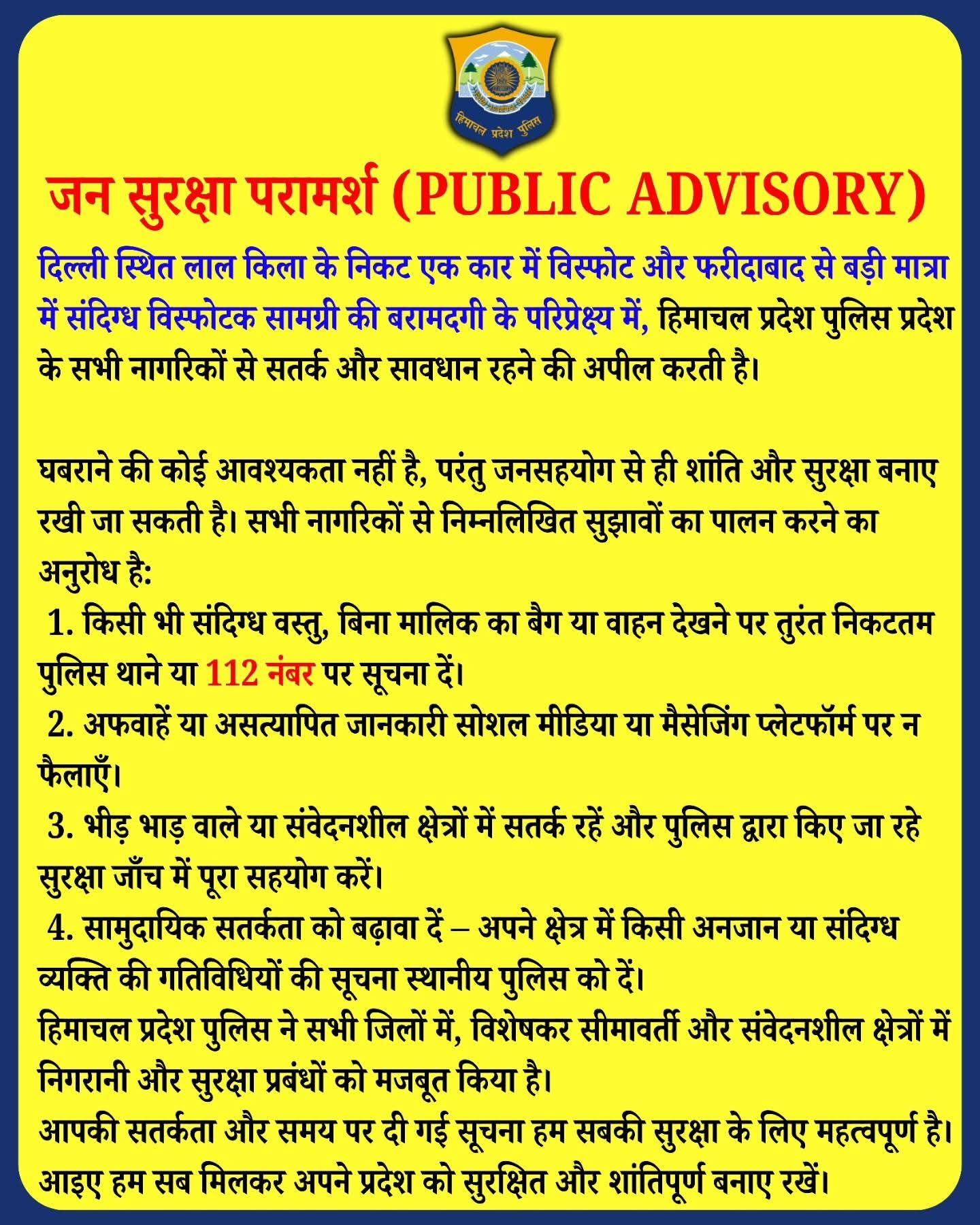 शिमला। दिल्ली के लाल किले के पास विस्फोट और फरीदाबाद से संदिग्ध सामग्री बरामदगी के मद्देनज़र हिमाचल प्रदेश में अलर्ट जारी किया है।