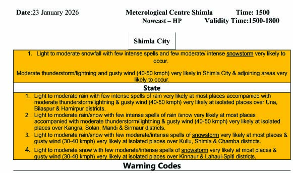 कुल्लू, शिमला और चंबा जिलों में ज्यादातर जगहों पर हल्की से मध्यम बारिश/बर्फबारी के साथ बर्फीले तूफान की कुछ मध्यम/तेज़ बौछारें और कुछ अलग-अलग जगहों पर तेज हवाएं (30-40 किमी प्रति घंटा) चलने की बहुत संभावना है।
