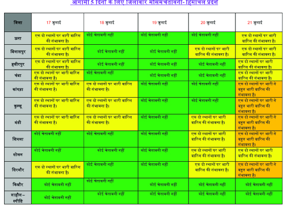 17, 18 और 20 जुलाई को अलग-अलग स्थानों पर एक या दो बार भारी बारिश होने की संभावना है। 21 और 23 जुलाई तक अलग-अलग स्थानों पर एक या दो बार भारी से बहुत भारी बारिश होने का अनुमान है। इसको लेकर ऑरेंज अलर्ट जारी है।