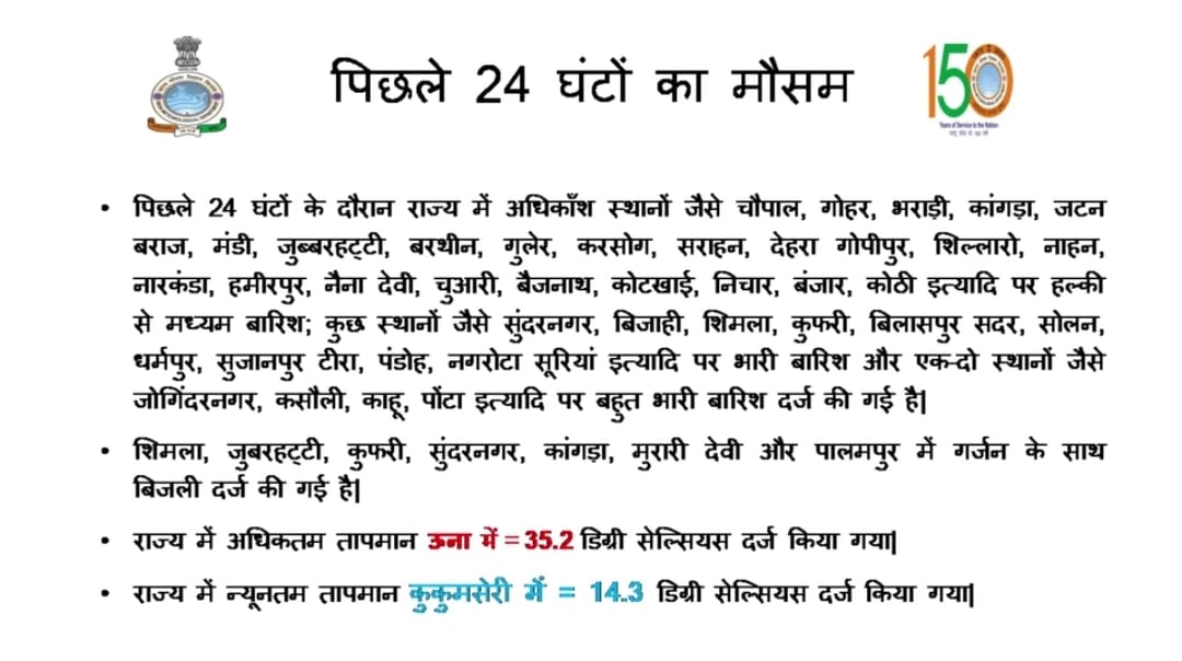 मौसम विज्ञान केंद्र शिमला की अपडेट के अनुसार पिछले 24 घंटे में सुंदरनगर, शिमला, कुफरी, बिलासपुर सदर, सोलन, धर्मपुर, सुजानपुर टीहरा, पंडोह और नगरोटा सूरियां आदि में भारी बारिश हुई है।