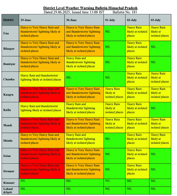 चंबा, कुल्लू में भारी बारिश को लेकर येलो अलर्ट है। 30 जून के लिए ऊना, बिलासपुर, कांगड़ा, मंडी, सोलन और सिरमौर में एक दो स्थानों में भारी से बहुत भारी बारिश को लेकर ऑरेंज अलर्ट है।