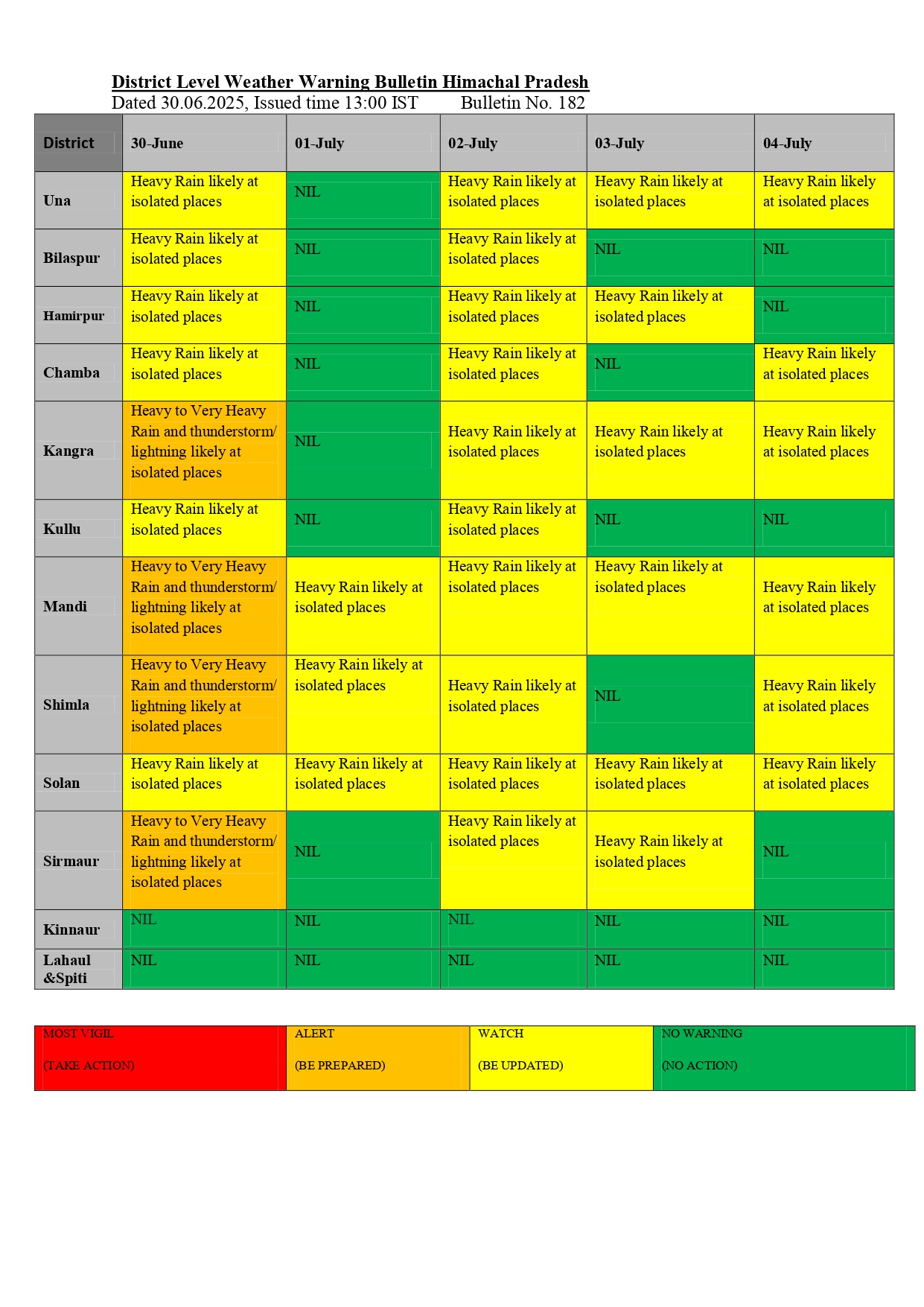 ऊना, बिलासपुर, हमीरपुर, चंबा, कुल्लू, सोलन में कुछ स्थानों पर भारी बारिश को लेकर येलो अलर्ट जारी है। पहली जुलाई को मंडी, शिमला और सोलन में भारी बारिश के लिए येलो अलर्ट है। बाकी जिलों में मौसम साफ रहने का अनुमान है।