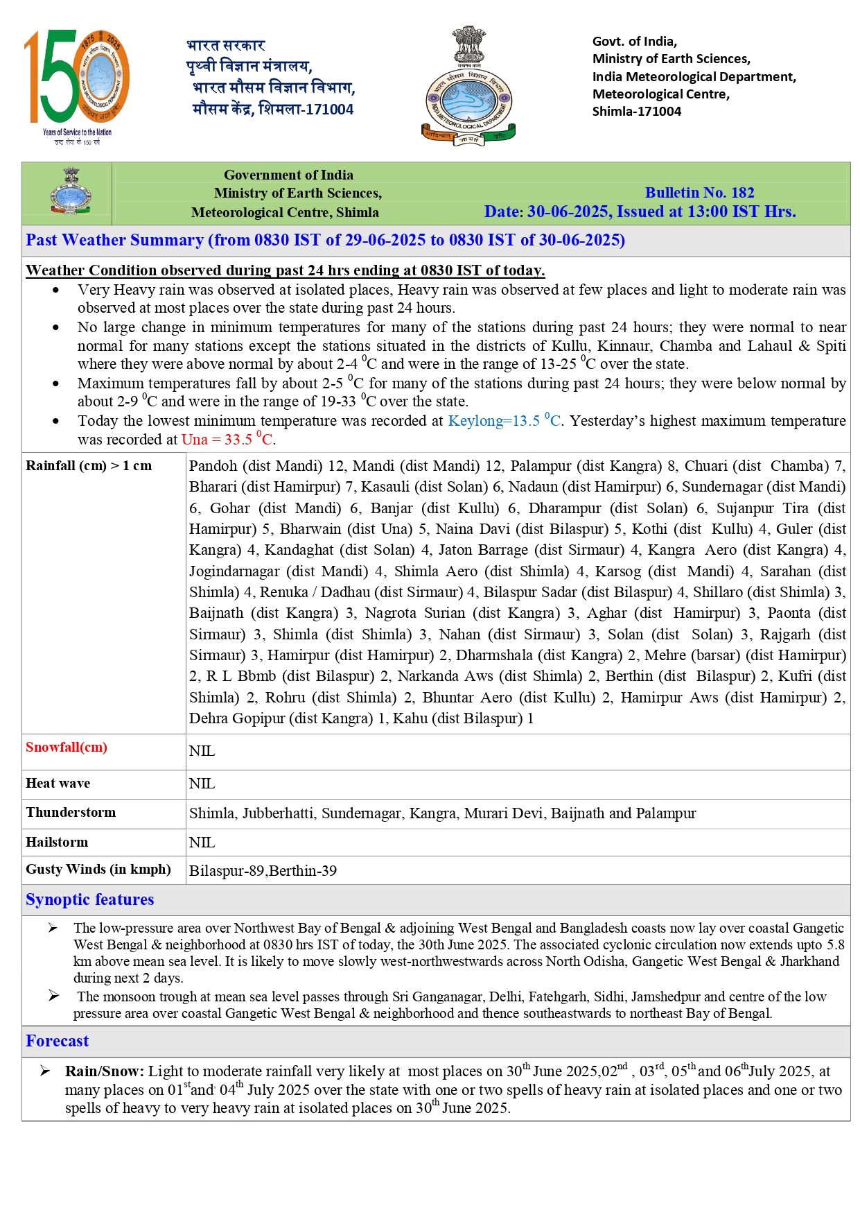 अपडेट के अनुसार 30 जून के लिए कांगड़ा, मंडी, शिमला, और सिरमौर जिलों में एक दो स्थानों पर भारी से बहुत भारी बारिश और आंधी/बिजली गिरने को लेकर ऑरेंज अलर्ट जारी है।