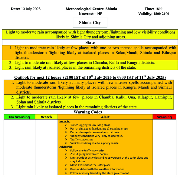 अगले 12 घंटों का पूर्वानुमान (10 जुलाई 2025 रात 9 बजे से 11 जुलाई 2025 सुबह 9 बजे तक) के अनुसार कांगड़ा, मंडी और सिरमौर जिलों में कुछ स्थानों पर मध्यम गरज/बिजली के साथ कई स्थानों पर हल्की से मध्यम बारिश और कुछ बार तीव्र बौछारें पड़ने की संभावना है।