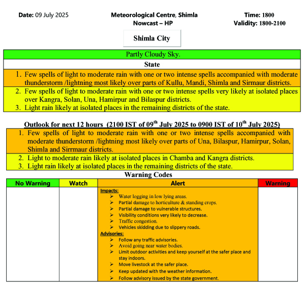 अगले 12 घंटों के पूर्वानुमान (09 जुलाई 2025 को रात 9 बजे से 10 जुलाई 2025 सुबह 9 बजे तक) के अनुसार ऊना, बिलासपुर, हमीरपुर, सोलन, शिमला और सिरमौर जिलों के कुछ हिस्सों में हल्की से मध्यम बारिश के साथ एक या दो तीव्र दौर के साथ मध्यम तूफान/बिजली गिरने की संभावना है।
