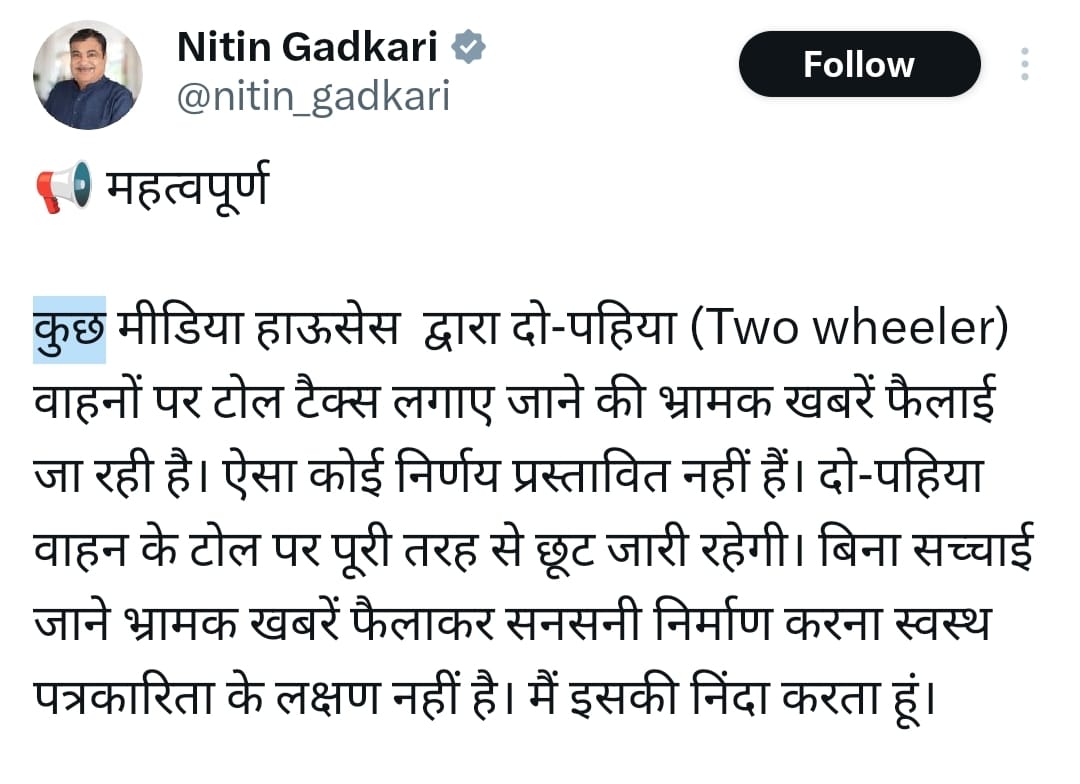 ऐसा कोई निर्णय प्रस्तावित नहीं है। दो पहिया वाहन के लिए टोल पर पूरी तरह से छूट जारी रहेगी। बिना सच्चाई जाने भ्रामक खबरें फैलाकर सनसनी निर्माण करना स्वस्थ पत्रकारिता के लक्षण नहीं हैं। मैं इसकी निंदा करता हूं।