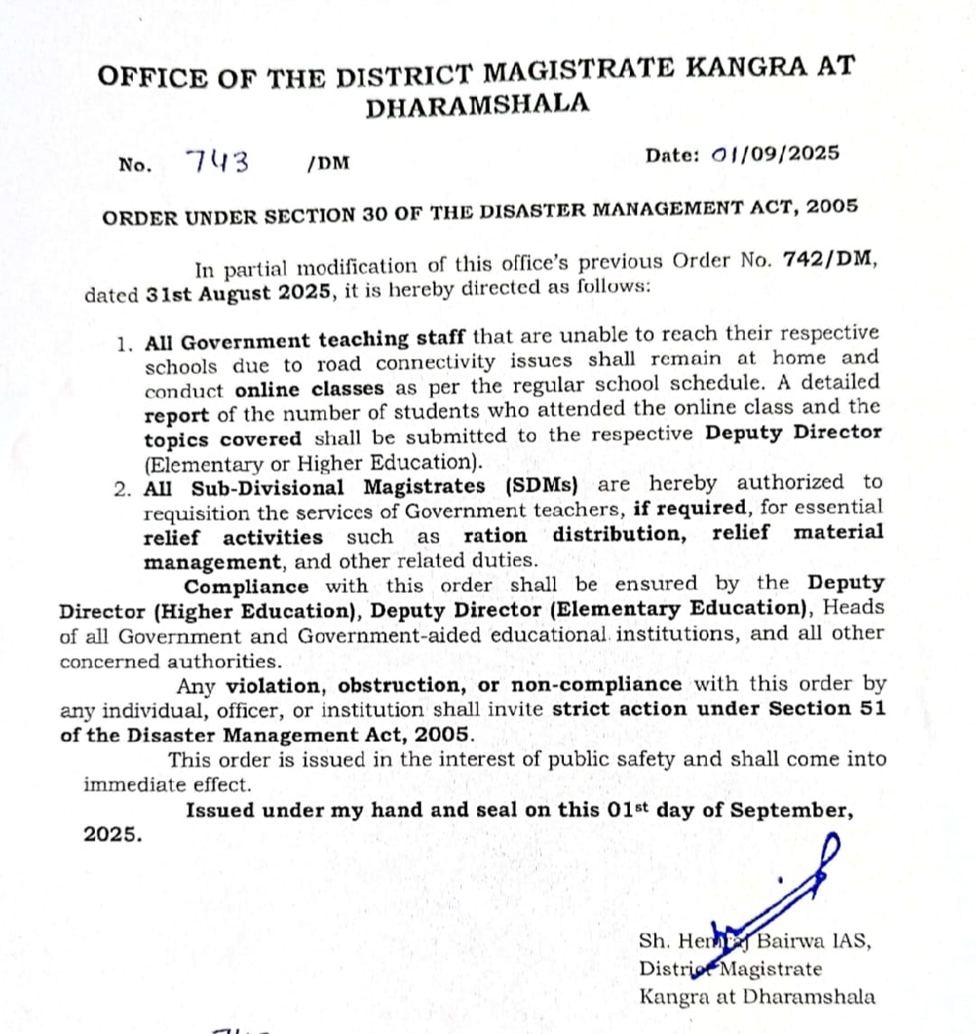 धर्मशाला। कांगड़ा जिला में सभी सरकारी शिक्षण कर्मचारी जो सड़क संपर्क संबंधी समस्याओं के कारण अपने-अपने स्कूलों तक पहुंचने में असमर्थ हैं, वे घर पर ही रहेंगे और नियमित स्कूल कार्यक्रम के अनुसार ऑनलाइन कक्षाएं संचालित करेंगे। कितने छात्रों ने ऑनलाइन क्लास अटेंड की और किस विषय को कवर किया इसकी रिपोर्ट संबंधित उप निदेशक को देनी होगी। इस बारे डीसी कांगड़ा हेमराज बैरवा ने आपदा प्रबंधन एक्ट 2005 के सेक्शन 30 के तहत आदेश जारी कर दिए हैं।