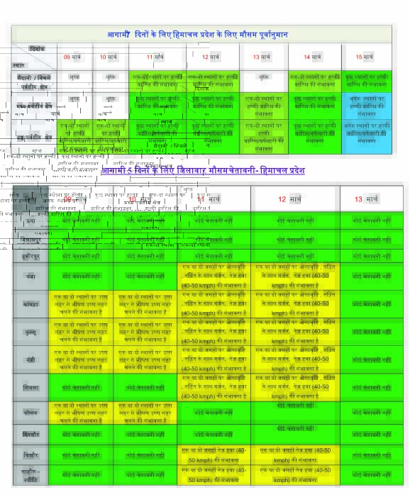 मौसम विज्ञान केंद्र शिमला की अपडेट के अनुसार 9, 10 औप 13 मार्च को ऊंची पहाड़ी क्षेत्रों में छिटपुट स्थानों पर हल्की बारिश/बर्फबारी की संभावना है। 11, 12 और 14 मार्च को ऊंची और मध्य पहाड़ियों पर कुछ स्थानों और निचली पहाड़ी क्षेत्रों मैदानों पर छिटपुट स्थानों पर हल्की बारिश/बर्फबारी का अनुमान है। 15 मार्च को कुछ स्थानों पर हल्की बारिश/बर्फबारी की संभावना है।