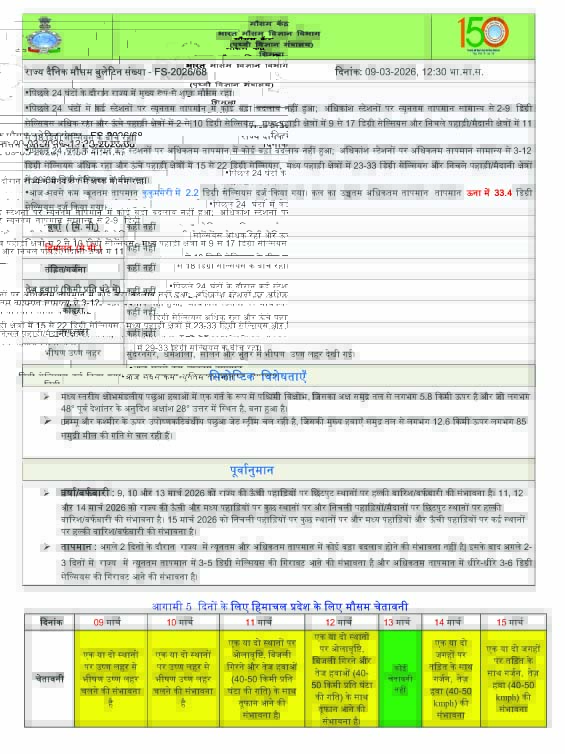 शिमला। हिमाचल प्रदेश 10 मार्च को कांगड़ा, कुल्लू, मंडी और सोलन में एक या दो स्थानों पर हीट वेव से भीषण हीट वेव की संभावना को लेकर येलो अलर्ट जारी किया गया है। वहीं, 11, 12 मार्च 2026 को चंबा, कांगड़ा, कुल्लू, मंडी, शिमला, किन्नौर और लाहौल स्पीति में एक दो स्थानों पर ओलावृष्टि, गरज के साथ बिजली गिरने, तेज हवा चलने की संभावना को लेकर येलो अलर्ट है। हवा की गति 40 से 50 किलोमीटर प्रतिघंटा रह सकती है।