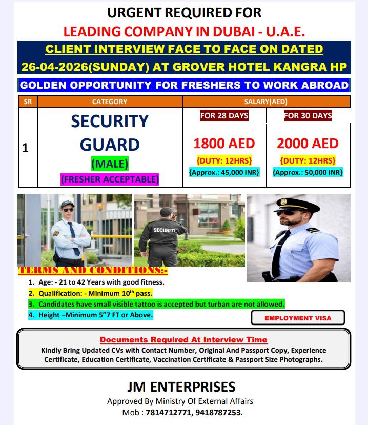 दुबई में नौकरी का सुनहरा मौका : बढ़िया सैलरी-कांगड़ा में 26 को होंगे इंटरव्यू