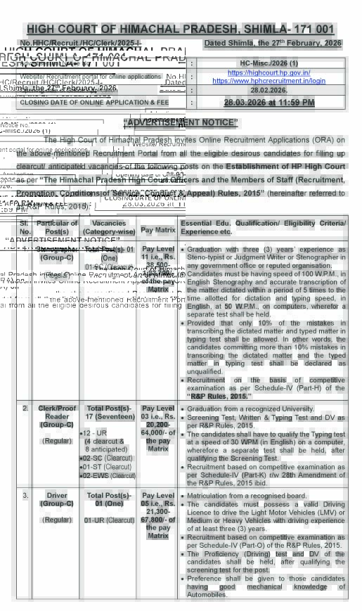 • हिमाचल हाईकोर्ट में स्टेनोग्राफर, क्लर्क और ड्राइवर के पदों पर भर्ती, इच्छुक जल्द करें आवेदन